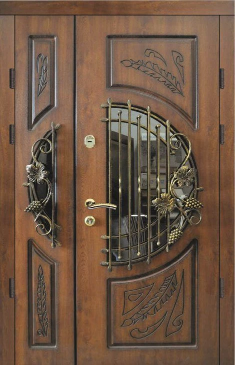 Поскольку в большинстве случаев устанавливаемые на входе в коттедж двустворчатые двери являются еще и предметом интерьера, украшающим здание, их дизайну предается особое значение. Эти двери, как правило, отделываются атмосферостойким МДФ, натуральным шпоном, массивом. Эффектно на таких дверях смотрится витражный узор, применение ковки, зеркальных элементов. Вариантов декора входной двустворчатой двери масса, тут все зависит от пожеланий заказчика.