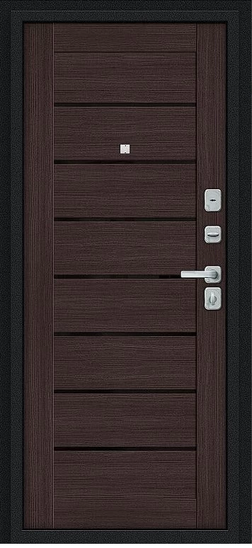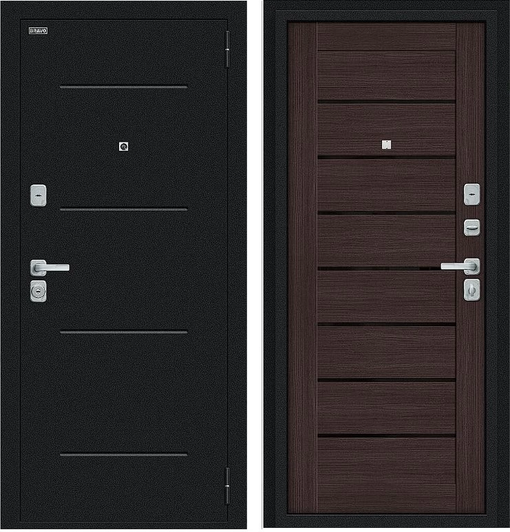 Надежная входная Дверь Браво Техно/BChrome Букле черное/Wenge Melinga премиум класса по цене 35 647 руб. Большая толщина стали защитит от проникновения в ваш дом, квартиру или коттедж. Используется очень качественная фурнитура: замки, цилиндры, ручки, защелки. Покрытие и отделка двери изготовлено под внимательным контролем производителя. Дверь имеет долгий срок службы и гарантию.